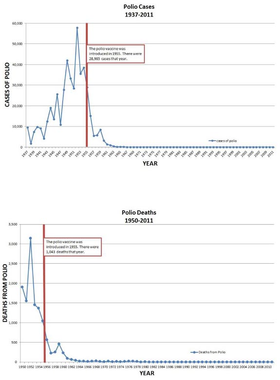 But by the time the vaccine began to be used on Americans the number of polio cases had declined to 28,985 with 1,043 deaths. Polio cases in England and Wales were also dropping precipitously, with no vaccine.